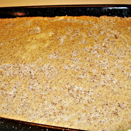 Orechovú piškótu upečieme tak, že v jednej miske vyšľaháme tuhý sneh z bielkov so štipkou soli. V druhej miske vyšľaháme do peny žĺtky s cukrom. Do žĺtkov primiešame pomleté orechy, múku premiešanú s kypriacim práškom na striedačku so snehom. Miešame zľahka stierkou, alebo vareškou. Cesto rozotrieme na papier na plechu na rozmer upečených plátov z lístkového cesta.