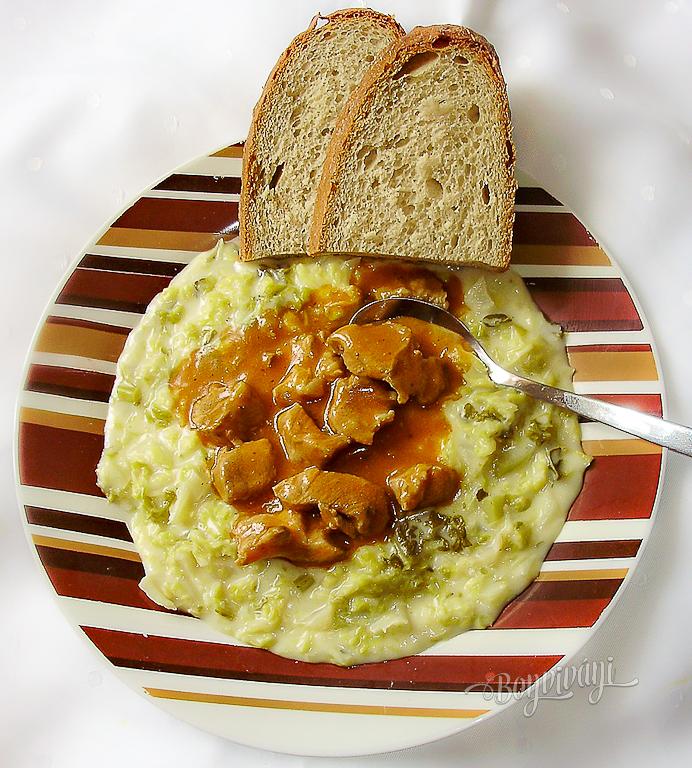 Voda sa skoro všetka odparí, podľa potreby dolejeme. Pred dovarením necháme v hrnci aspoň deci. Z masla a múky usmažíme svetlú zápražku do ktorej dáme po vypnutí prevoňať čerstvý pretlačený cesnak. Premiešame, zalejeme studeným mliekom a pridáme "do kelu". Povaríme a zjemníme smotanou. Podľa chuti dosolíme a dochutíme cukrom.
