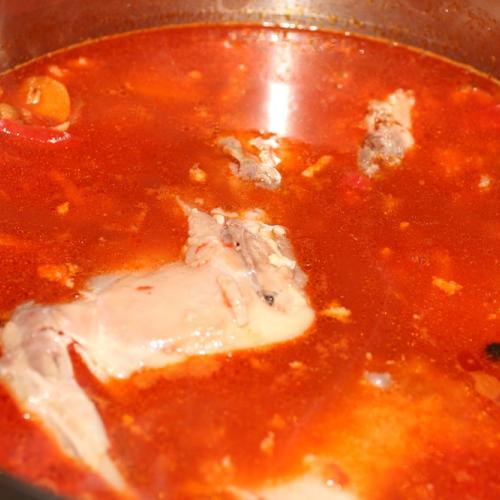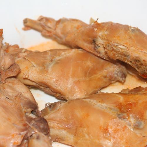 Masť roztopíme a orestujeme na nej na jemno nakrájanú slaninu. Pridáme na drobno nakrájanú cibuľu a restujeme do zlatova spolu s koreninami. Hrniec dáme bokom, do cibule pridáme mletú papriku, rýchlo zamiešame (skôr ako nám stihne zhorknúť). Pridáme osolené kusy králika a nakrájanú čerstvú papriku pre vôňu. Trošku opražíme a podlejeme takým množstvom teplej vody, aby sme zakryli skoro celé mäso. Pomaly dusíme (podľa veku králika) jednu až dve hodiny.