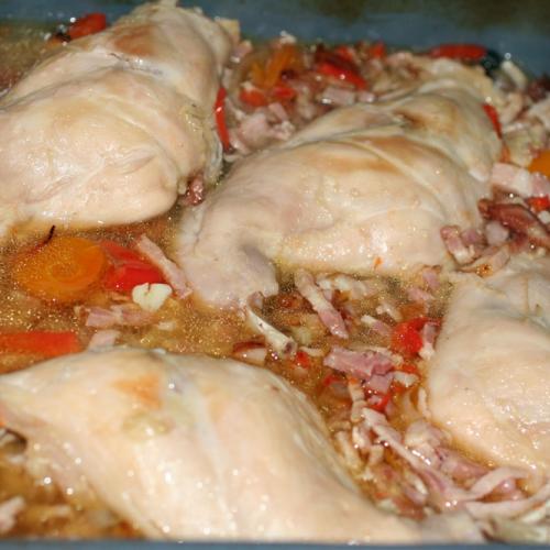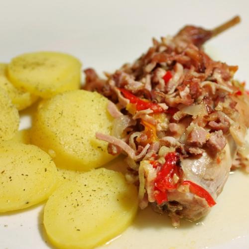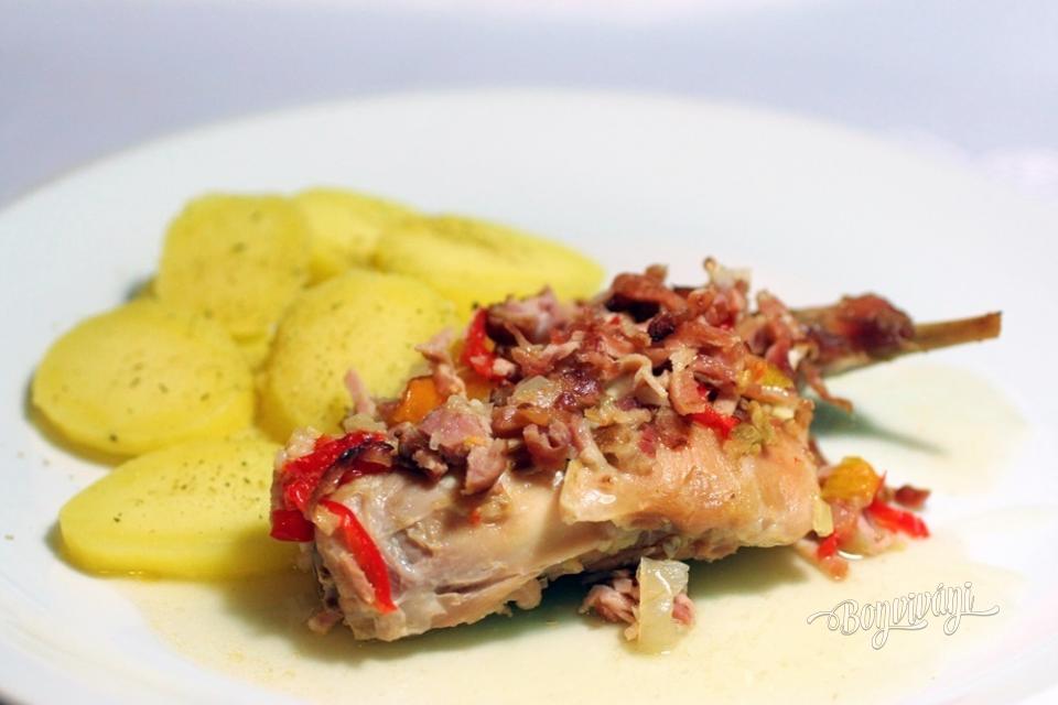 Stehná z domáceho králika upečené pod slaninou sú šťavnaté. A presne takto piekla králiky moja babka :)