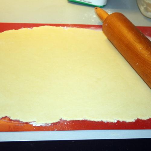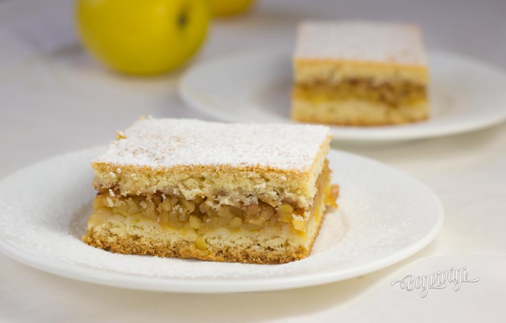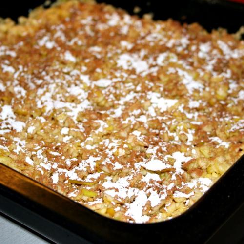 Z uvedených surovín spracujeme cesto, ktoré rozdelíme na dve časti. Prvú rozvaľkáme na pomúčenej podložke a pomocou valčeka prenesieme na plech. Cesto popicháme vidličkou. Očistené jablká na hrubo nastrúhame rovno na koláč, pokvapkáme citrónom a podľa kyslosti jabĺk ochutíme škoricovým cukrom alebo škoricou a cukrom.