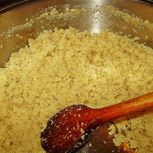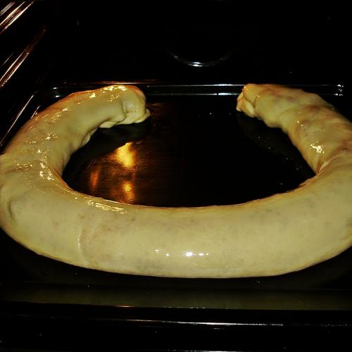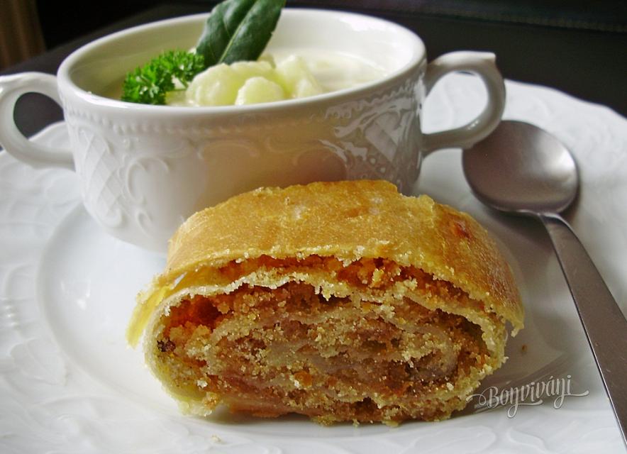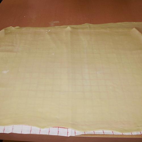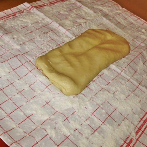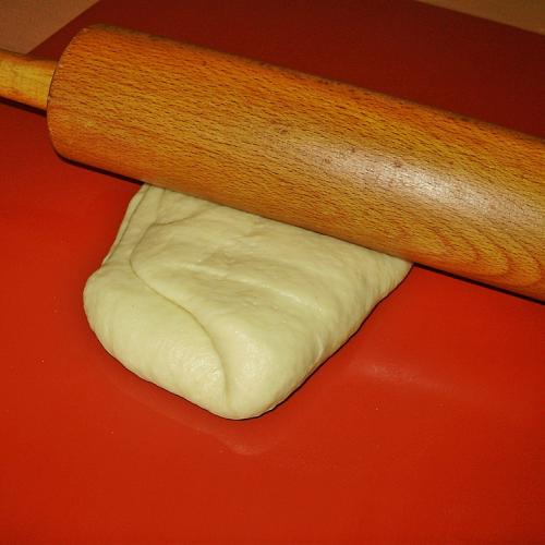 Následuje príprava cesta. V hrnčeku s vlažnou vodou rozpustíme masť z oškvarkov, pridáme celé vajce, cukor, soľ a rozmiešame. Do múky prilievame z hrnčeka tekutinu a spracujeme cesto. Cesto rukou poriadne vymiesime a dobre vybúchame valčekom. Potom ho dáme asi na hodinu oddychovať pod misku. Po hodine oddychovania dáme cesto na pomúčenú utierku. Na tenúčko ho rozvaľkáme.