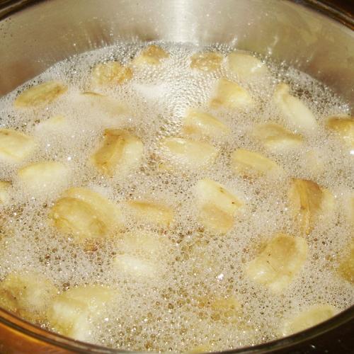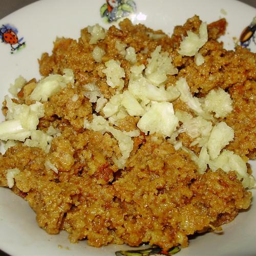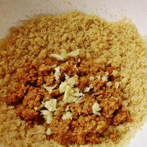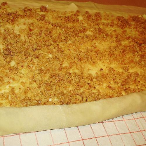 Než cesto oddýchne, udusíme krupicu. V kastróle osmažíme hrubú krupicu. Tú je treba stále miešať, aby neprihorela. Keď krupica dostáva béžovú farbu, poprská sa - sparí vodou a nechá sa pod pokrievkou nabobtnať. Krupica nesmie byť surová, preto sa musí udusiť asi desať minút. Potom treba krupicu najlepšie vidličkou premiešať, aby sa pekne rozdrobila. Vychladnutú dusenú krupicu zmiešame s oškvarkami a cesnakom. Túto oškvarkovú krupicu rozložíme po celom ceste a pomocou utierky tašku zvinieme.