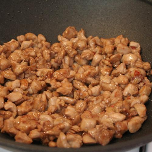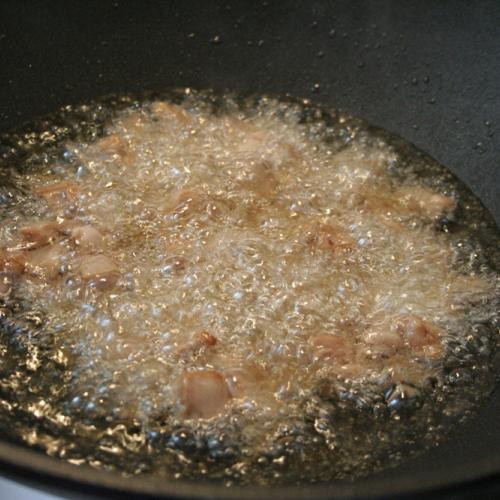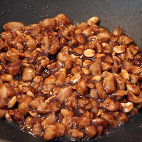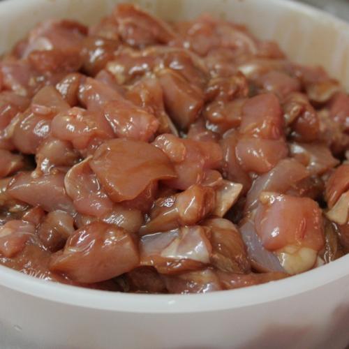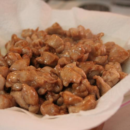 Kuracie mäso (vykostené stehná, alebo prsia) nakrájame na maličké kocky. Pripravíme marinádu, premiešame ju s mäsom a necháme asi pol hodiny marinovať. Vo woku rozpálime olej. Marinované mäso v menších dávkach ofritujeme v rozpálenom oleji. Trvá to vždy asi pol minúty, mäso vyberieme z oleja a necháme ho ztiecť z oleja na papierovej utierke. Olej pred ďalším mäsom necháme znovu rozpáliť.