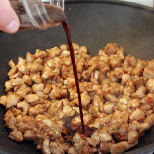 Olej z woku vylejeme a odložíme. Vo woku nám ostane len pár kvapôčok oleja a to stačí na ďalšiu prípravu. Wok znovu rozohrejeme, pridáme chilli papričky a na jemno nastrúhaný zázvor, orestujeme a pridáme ofritované mäso, ktoré ešte asi pol minúty prudko opečieme. Na mäso nalejeme zálievku a premiešame. Na zálievku je dobré použiť čierny ryžový ocot.