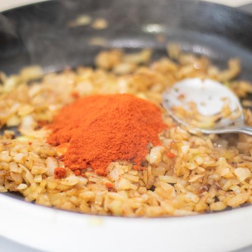 Keď aj cibuľa zmäkkne a zozlátne, pridáme papriku a všetko spolu krátko opečieme. Len krátko, aby paprika nezhorkla a hneď pridáme vývar. Premiešame, vrátime k základu mäso a pomaly dusíme pod pokrievkou asi pol hodinu až hodinu, kým mäso nebude mäkké a odpadávať od kosti. Pozor, mäso počas dusenia nesmie byť celé zakryté tekutinou, tak vývar prilievame podľa potreby postupne.