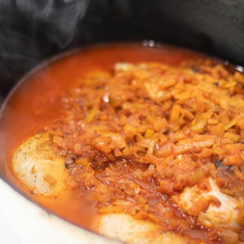 Keď je mäso mäkké, vyberieme ho a zbavíme kostí a kože, pokiaľ to tak preferujeme. Omáčku zatiaľ zjemníme smotanou a necháme prevariť. Mäso vrátime do omáčky a spolu krátko prevaríme. Dochutíme soľou korením, alebo kvapkou citrónovej šťavy podľa chuti. Ak je omáčka riedka, môžeme ju zahustiť. V troche mlieka rozmiešame hladkú múku a túto zátrepku vlejeme cez sitko do omáčky, krátko prevaríme. Kura na paprike podávame s cestovinami, haluškami, alebo s knedľou.