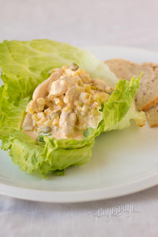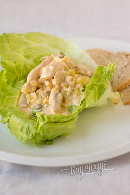Jednoduchý šalát, na prípravu ktorého môžete použiť kuracie prsia nakrájané na rezance a orestované s obľúbeným korením na grilované kura. Chutnú variantu získame aj pri použití mäsa z klasicky ugrilovaného kuraťa.