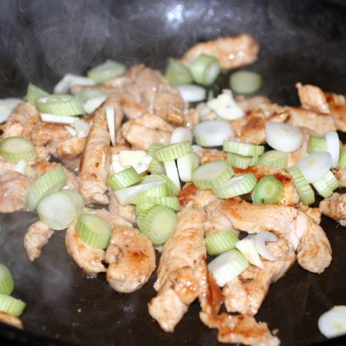 Kuracie prsia nakrájané na rezance, posolené a premiešané s olejom je dobré mať dopredu pripravené v chladničke. Soľ používam bylinkovú morskú.