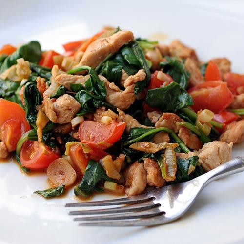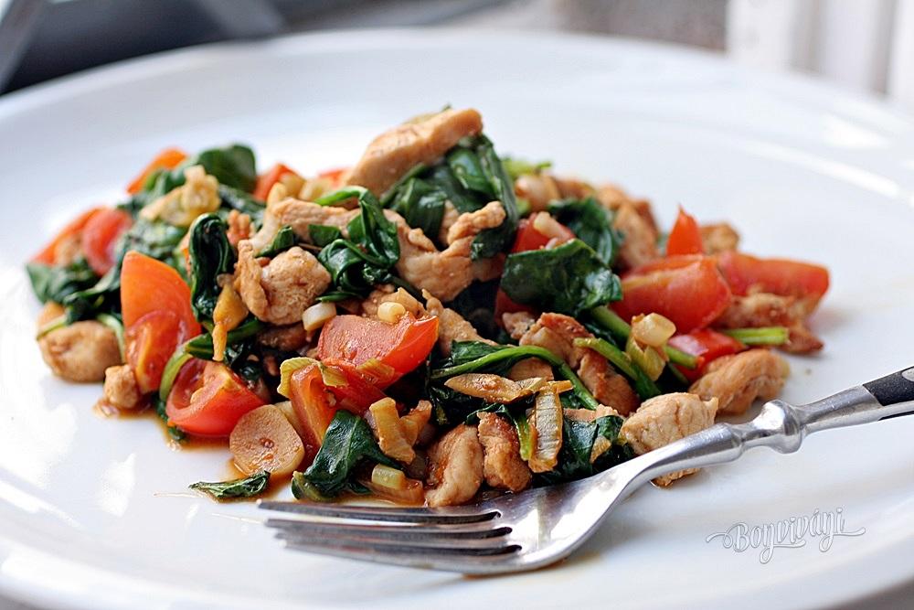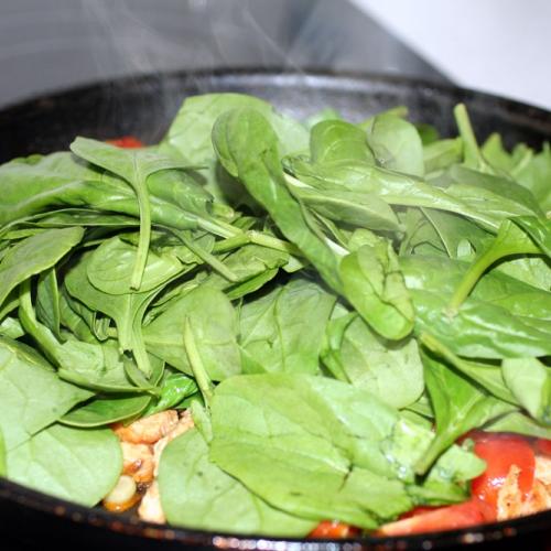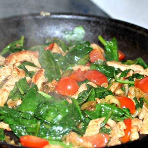 Panvicu rozpálime a mäso prudko orestujeme, aby sa zatiahlo. Pridáme nasekanú cibuľu a restujeme ďalej. Keď sú mäso aj cibuľa pekne orestované, pridáme cherry rajčiny s nasekaným cesnakom a ešte všetko spolu orestujeme bez podlievania. Prihodíme na panvicu dve hrste baby špenátu.