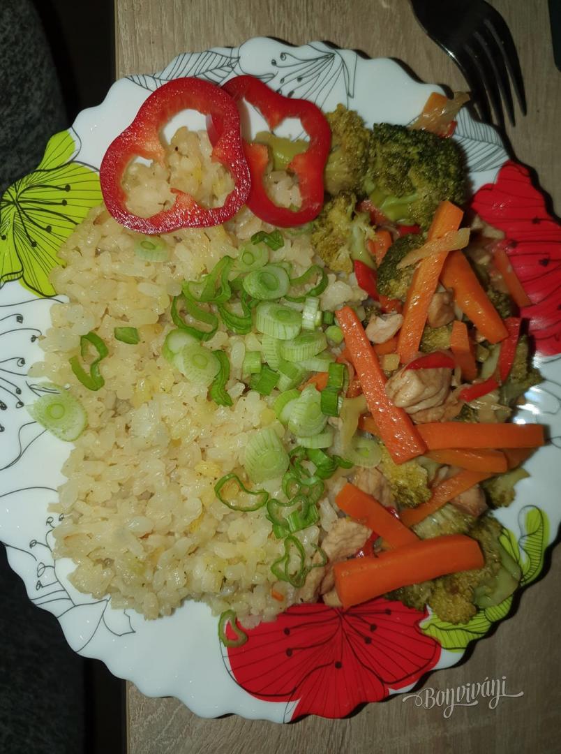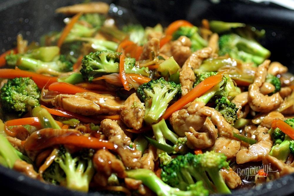 Keď je zelenina pekne opečená, pridáme ružičky surovej brokolice, podlejeme trochou (asi 1 dcl) vody, šťavu z polovice citróna a panvicu zakryjeme (paríme asi 3 minúty). Brokolica aj zelenina zmení farbu na svetlejšiu, ale zostane chrumkavá. Potom panvicu odokryjeme, pridáme mäso aj s omáčkou a krátko všetko prevaríme.
