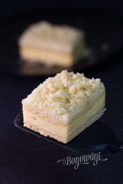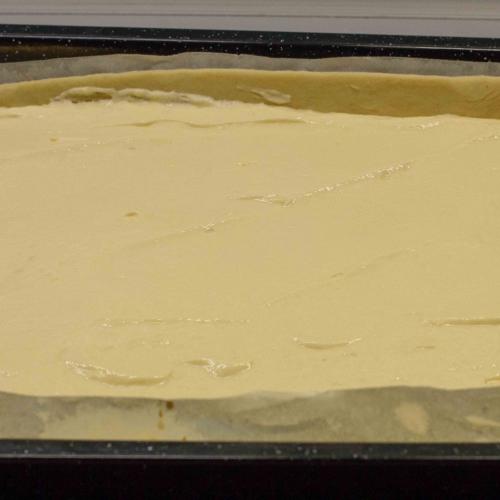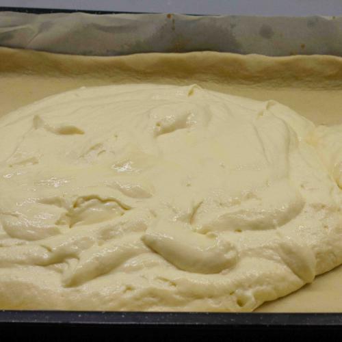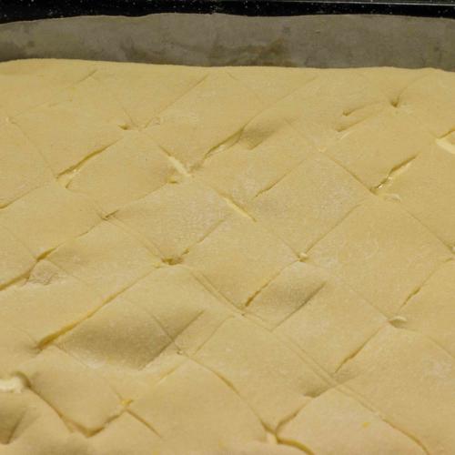Plnku rozložíme na väčšiu polovicu cesta na plech. Druhú polovicu cesta tiež rozvaľkáme a položíme na tvarohovú plnku. Nožíkom krížom-krážom ponarezujte, aby mal tvaroh dosť priestoru, keď sa pri pečení bude dvíhať. Koláč tak bude nadýchanejší. Na vrch koláča dáme posýpku - drobenku, ale koláč je výborný aj bez nej.