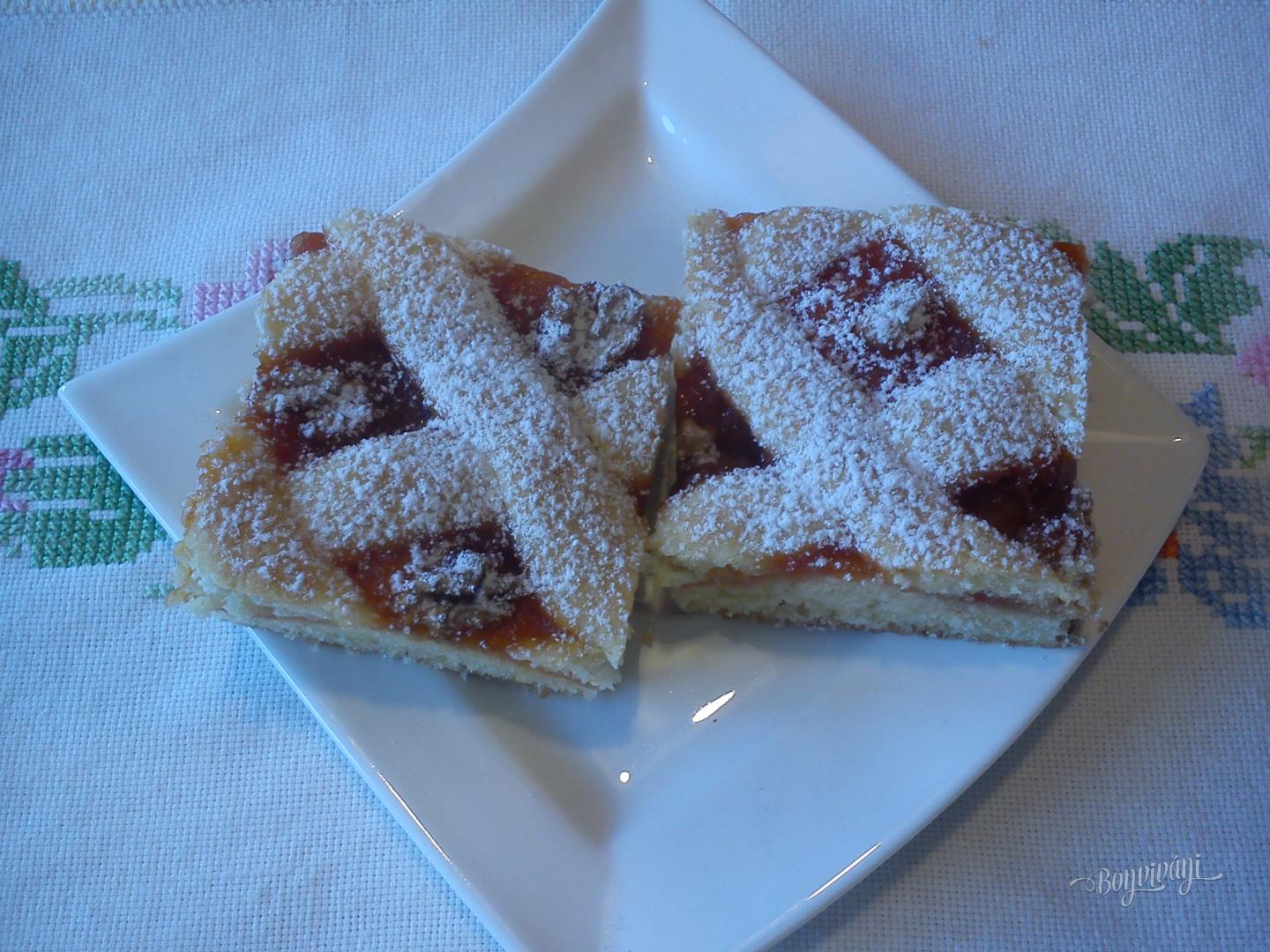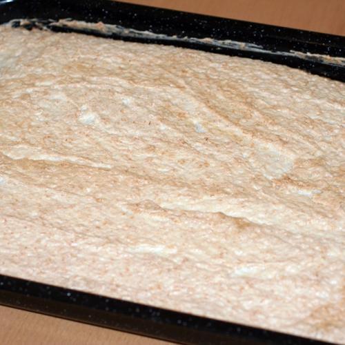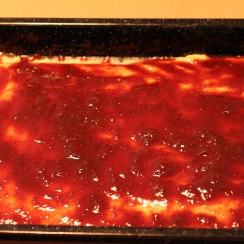 Vložíme do vopred vyhriatej rúry na 180 stupňov ale len na 10-15 minút. Cesto má byť totiž len predpečené. Potom cesto vyberieme a na povrch rovnomerne rozotrieme džem. Dobré je použiť kyslastý džem, marhuľový, alebo ríbezľový.
