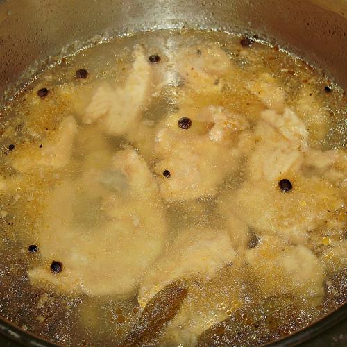 Najskôr nalejeme do hrnca vodu s octom, pridáme koreniny, osolíme a vložíme do nej kúsky ryby. Pomalým tiahnutím lososa v náleve povaríme. Ale skutočne na najmenšom plameni, aby voda skoro vôbec nevrela. Takto varíme lososa asi 20 minút. Nerozpadne sa, udrží tvar a naberie do seba všetky chute. Potom lososa zlejeme cez sitko.
