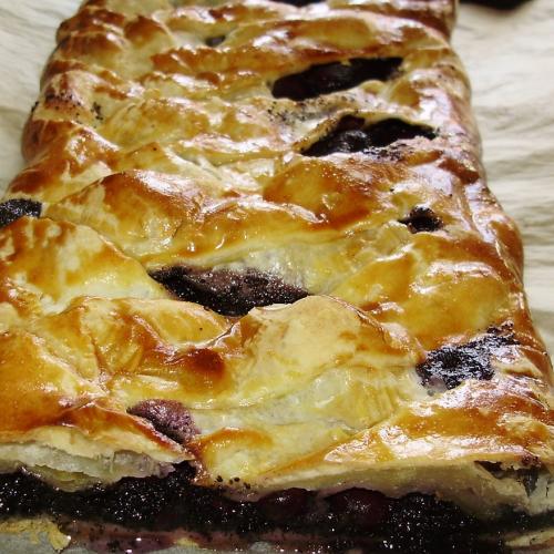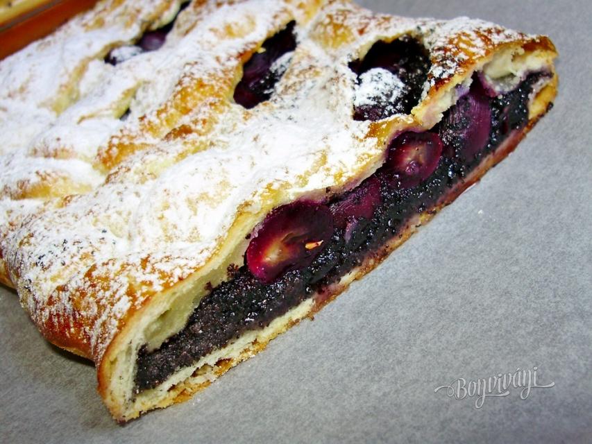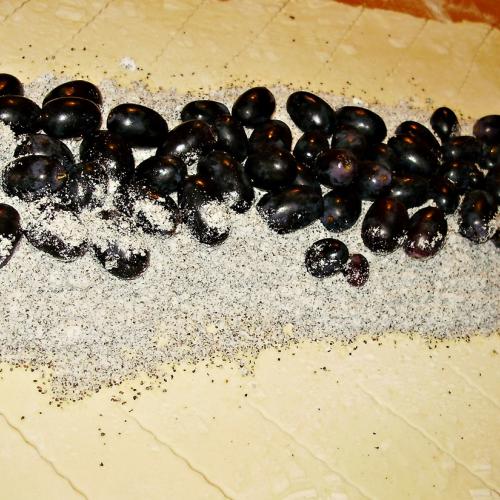 Mne ostal zamiešaný mak s cukrom z nedávneho pečenia, tak som ho použila a namiesto višní a jabĺk som dala čierne hrozno.