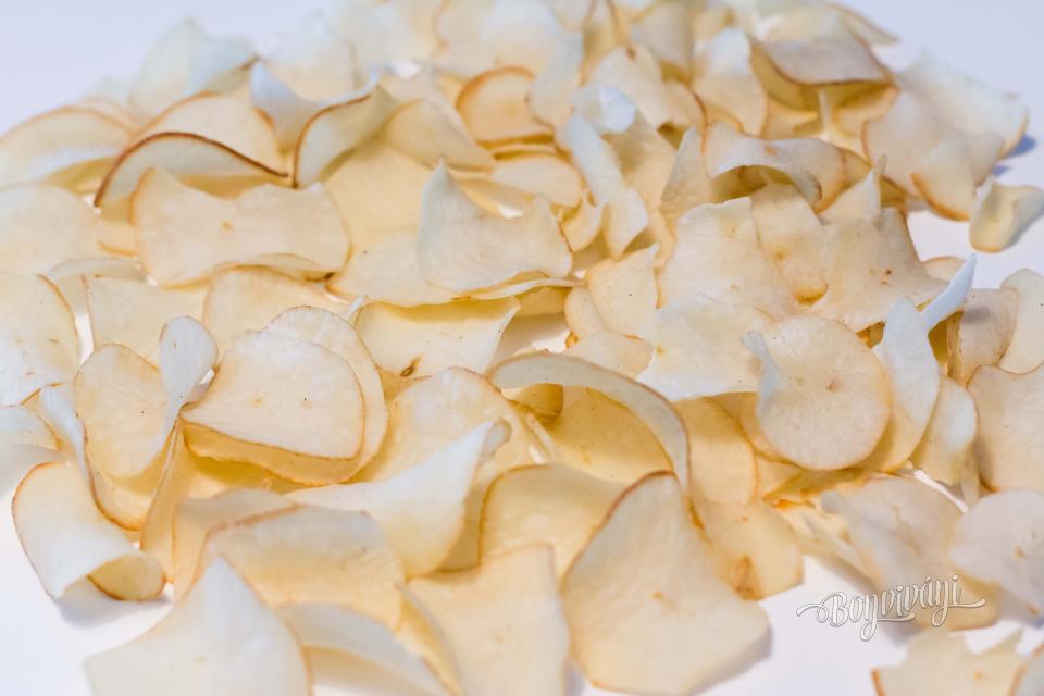 Usmažené chipsy rýchlo vyberáme pomocou dierkovanej naberačky a na papierových obrúskoch ich zbavíme prebytočného oleja. Nezjednené chipsy je možné uchovávať vo vzduchotesnej nádobe až niekoľko týždňov. Najlepšie sú však čerstvé.