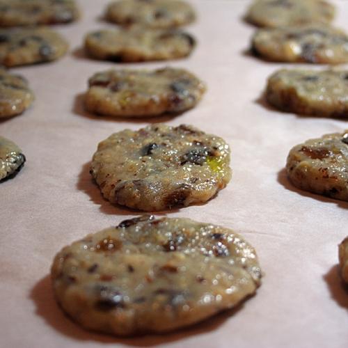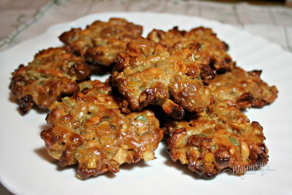 Pridáme nasekané arašidy, kandizovanú kôru z citróna a pomaranču (ja som ju doplnila aj kandizovaným zázvorom). Ďalej pridáme nasekané lieskovce a hrozienka. Všetko spolu premiešame a necháme vychladnúť.