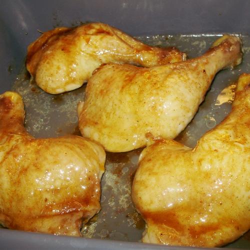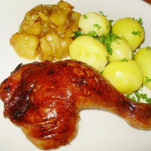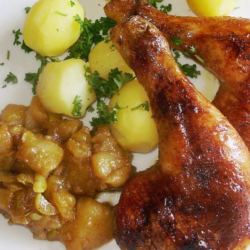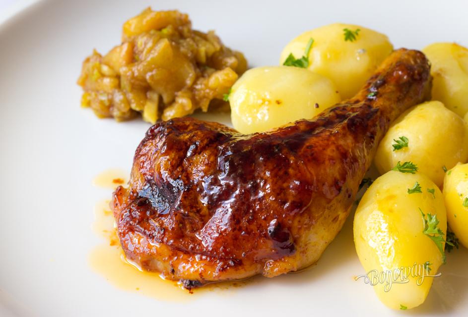 Kuracie stehná jemne potierané medovou marinádou nie sú až tak sladké, ako by sa zdalo. Hruškového čatní je zase ostro-kyslo-sladké. Občas je chuť aj na takéto kombinácie :)