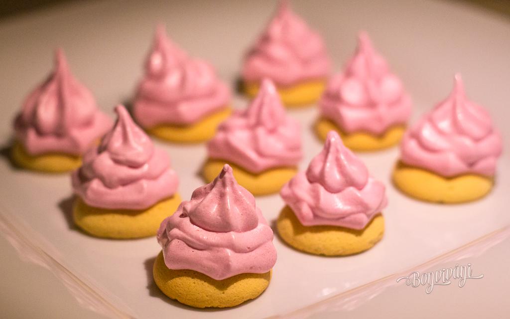 Do hrnčeka dáme variť pomaly vodu a naň položíme pevnú plastovú misku s bielkami a cukrom. Vyšľaháme hustú tuhú teplú penu, do ktorej prišľaháme ríbezľový džem a citrónovú šťavu. Hmotu dáme do cukrárskeho vrecúška a ešte vlažnú ju nastriekame na piškóty. Necháme voľne pri izbovej teplote do druhého dňa vyschnúť, alebo po hodine krátko presušíme v rúre na 90 stupňov. Tak, aby zaschol len povrch a stred ostal mäkký. Ak máte chuť, namočte si ich do čokolády, ale aj bez nej sú super!