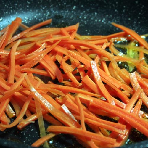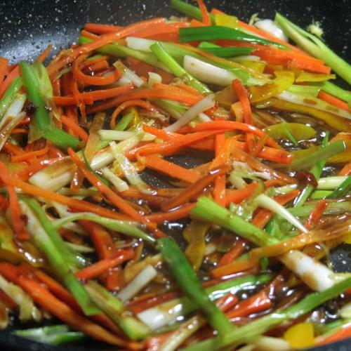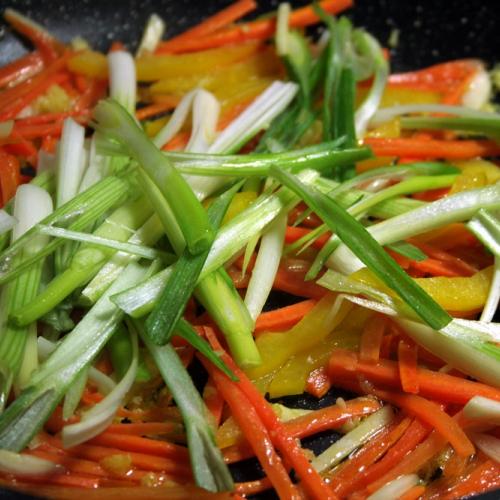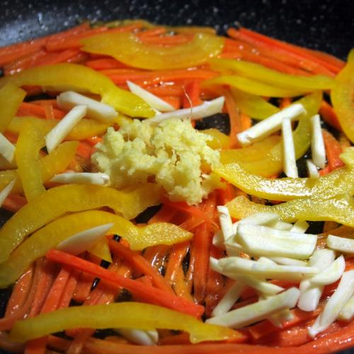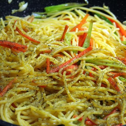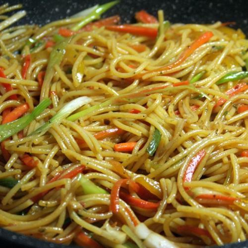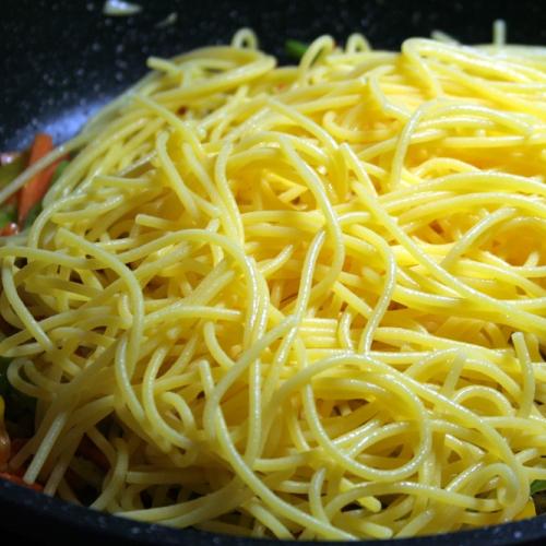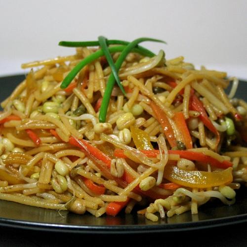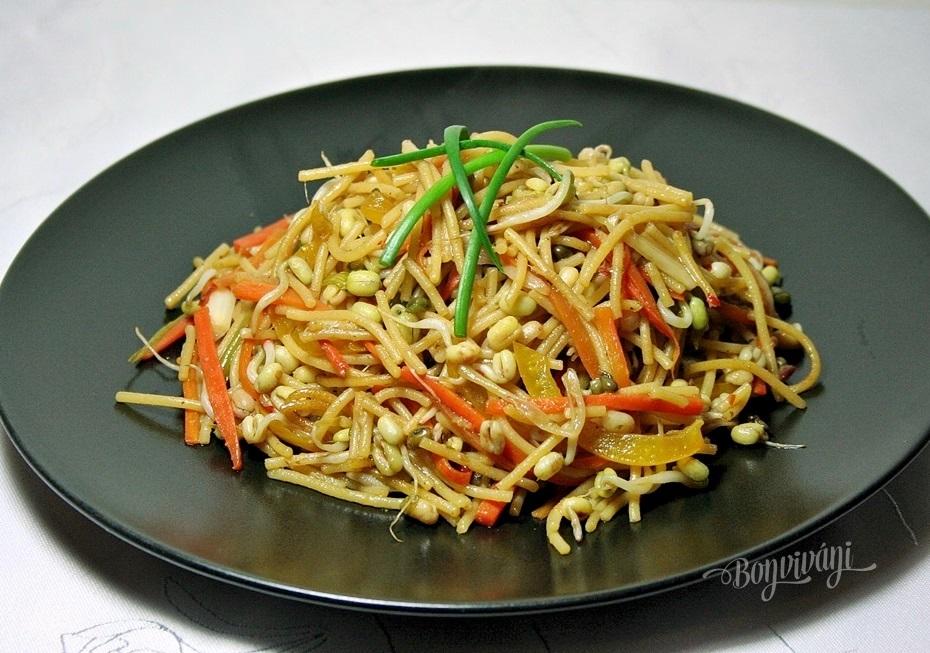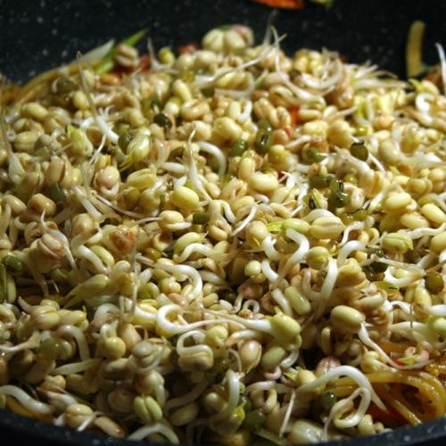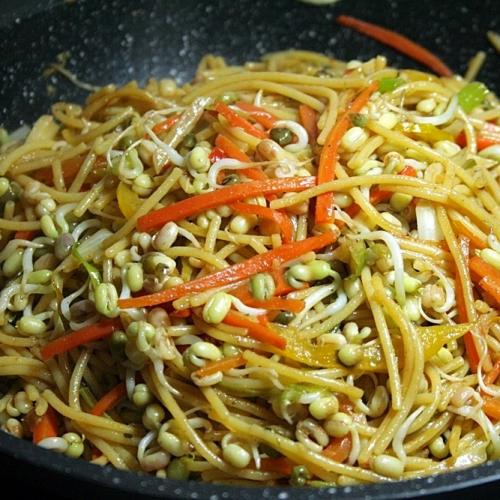 Hrsť uvarených špagiet, trochu zeleniny a hlavne zdravé mungo klíčky.