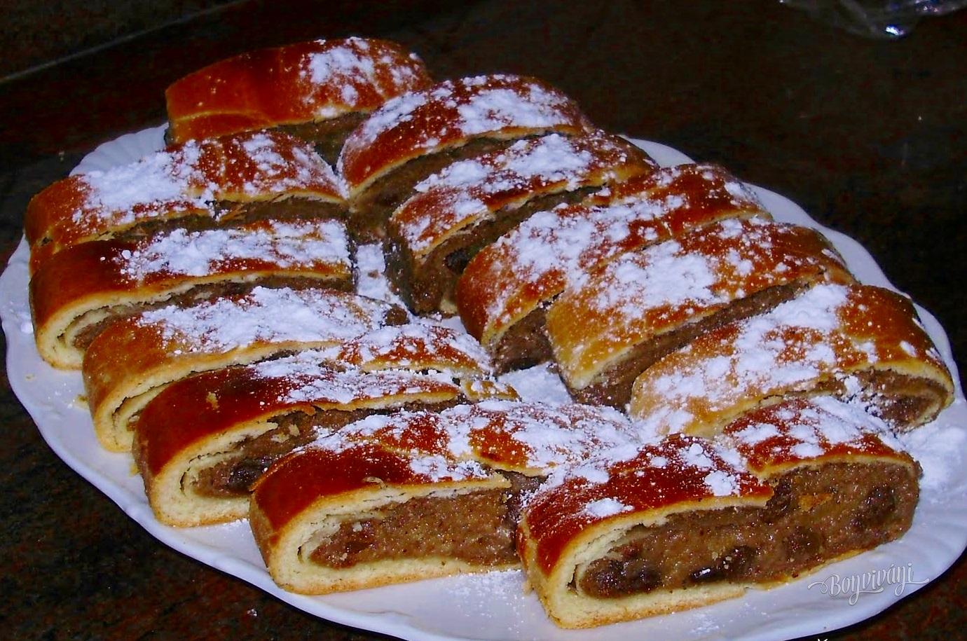Plnku pripravíme tak, že pomelieme orechy a sparíme horúcim mliekom. Pridáme hrozienka namočené v rume a cukor kryštál aj vanilkový.