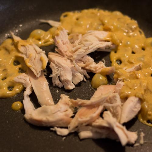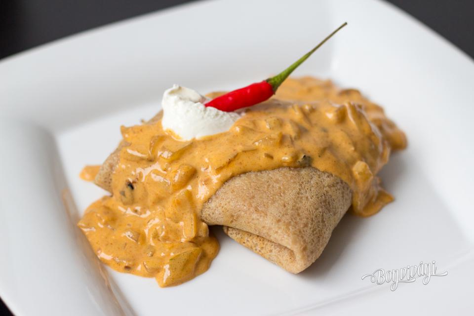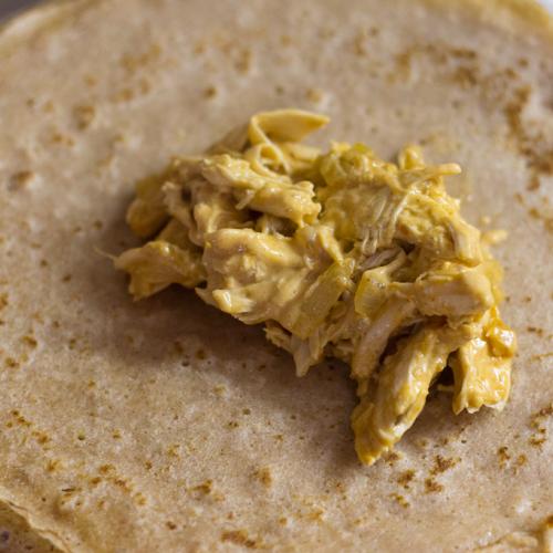 Za hrsť kuracieho mäsa, pečeného, prípadne vareného, zohrejeme s trochou omáčky a zabalíme ho do palacinky. Na tanieri palacinku ešte prelejeme omáčkou a ozdobíme trochou kyslej smotany.