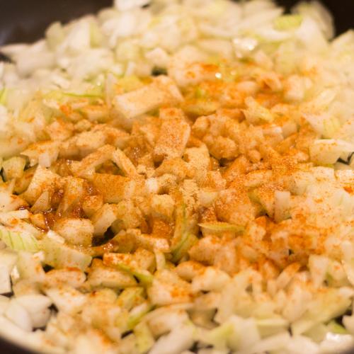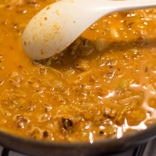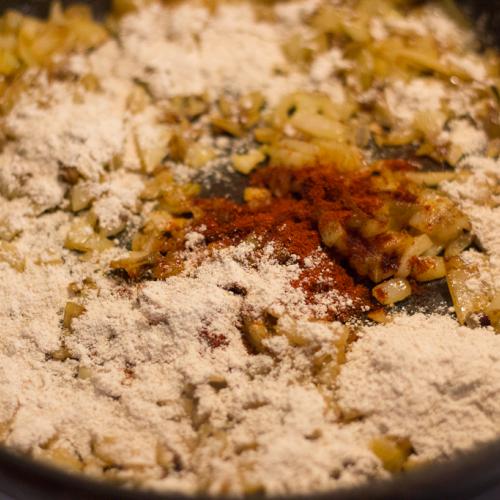 Nakrájame jednu veľkú, alebo dve menšie cibule najemno. Orestujeme na oleji spolu s chilli a troškou cukru. Osolíme a premiešavame na väčšom plameni asi 5 minút, kým nie je cibuľka do zlatista opečená. Potom pridáme sladkú papriku a múku, premiešame a stíšime plameň na minimum.