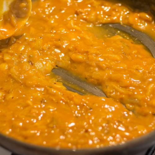 Prilejeme vodu a na miernom plameni za stáleho miešania varíme asi ďaľších 5 minút do zhustnutia.