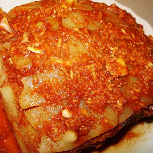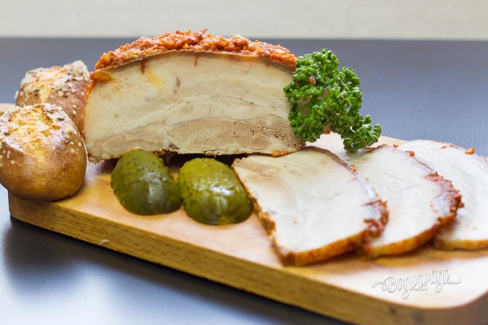 Kus krásneho bôčika vložíme do vriacej posolenej vody spolu s tromi strúčikmi cesnaku variť asi na jednu hodinu. Mäso nesmie byť ani surové, ale ani prevarené. Medzitým si rozotrieme pár strúčikov cesnaku so soľou. Do misky nasypeme trochu mletej papriky, pridáme cesnak a prilejeme troška vývaru z bôčika. Zamiešame hustejšiu kašičku a touto natrieme horúci bôčik. Dáme vychladnúť a studený krájame.