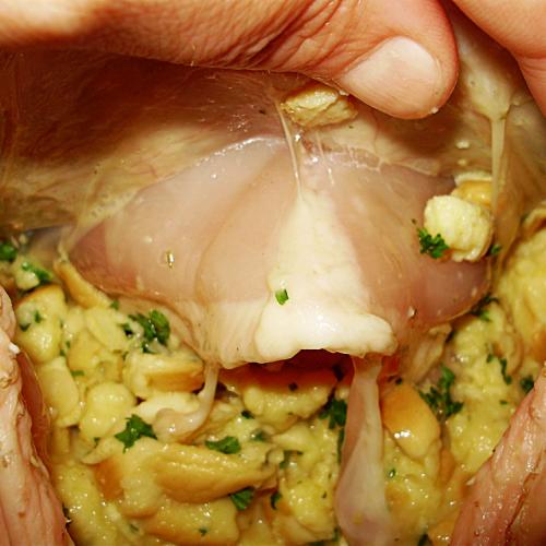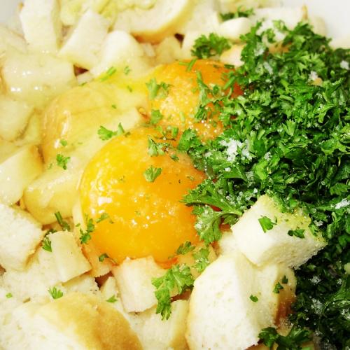 Najskôr si spravíme plnku: Do misky nakrájame na kocky rožky, pokropíme ich mliekom, rozbijeme vajíčka, troška osolíme, nastrúhame kúsok muškátového orieška a na jemno nasekáme čerstvú petržlenovú vňať. Pridáme nasekaný cesnak a troška mletej rasce. Všetko zamiešame, aby sa hmota spojila a pripravíme na plnenie.