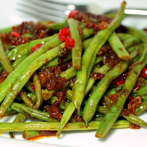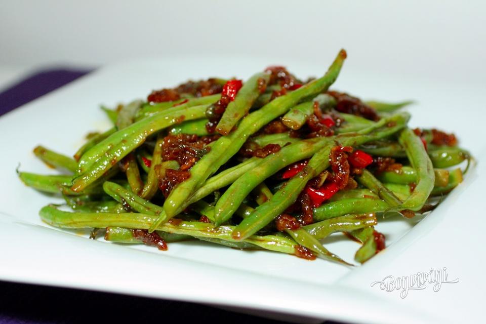 Na panvicu nalejeme asi pol deci vody a lyžicu oleja. Privedieme k varu, vhodíme tam očistené fazuľky, osolíme, pridáme šťavu z polky citróna a chvíľku povaríme. Asi po 4 minútach sa voda začne odparovať a fazuľky dostanú svetlejšiu farbu. Začnú sa opekať a vtedy už treba premiešavať, aby sa rovnomerne opiekli. Pridáme lisovaný cesnak, nastrúhaný zázvor a pokrájané chilli papričky, alebo feferónky.
