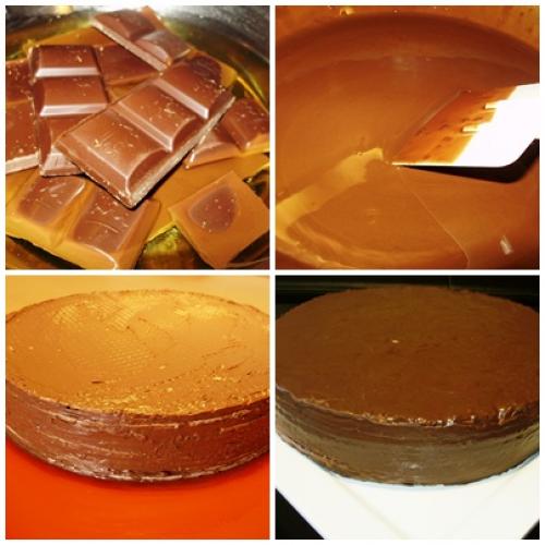 Nad parou vo vodnom kúpeli ich necháme rozpustiť a potom vychladnúť, ale nie stuhnúť. Elektrickým šľahačom vyšľaháme maslo s polovicou cukru do peny. Žĺtky vyšľaháme s druhou polovicou cukru. Žĺtky s cukrom vmiešajte do masla až po vychladnutí, ináč by sa krém zrazil.