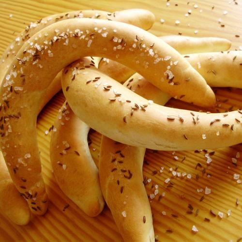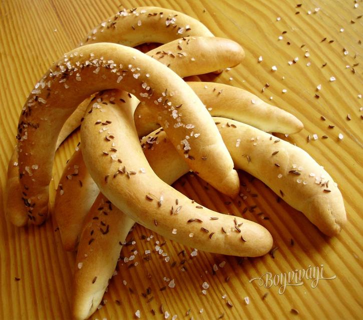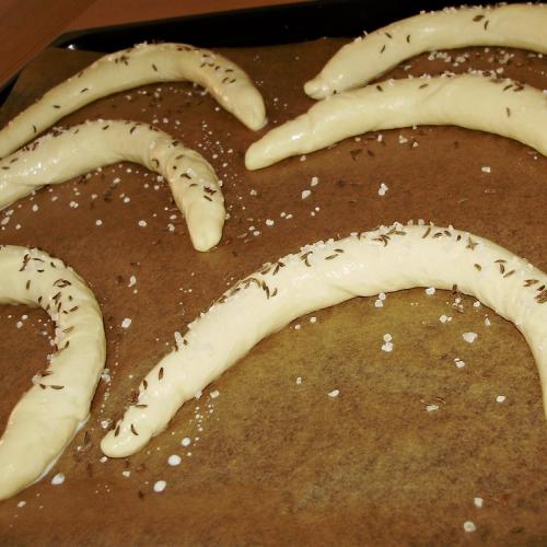 Väčšinou sa pred pečením sypú hrubozrnnou soľou a kmínom. Ja som ich pred vložením do rúry potrela mliekom, posypala soľou a rascou.