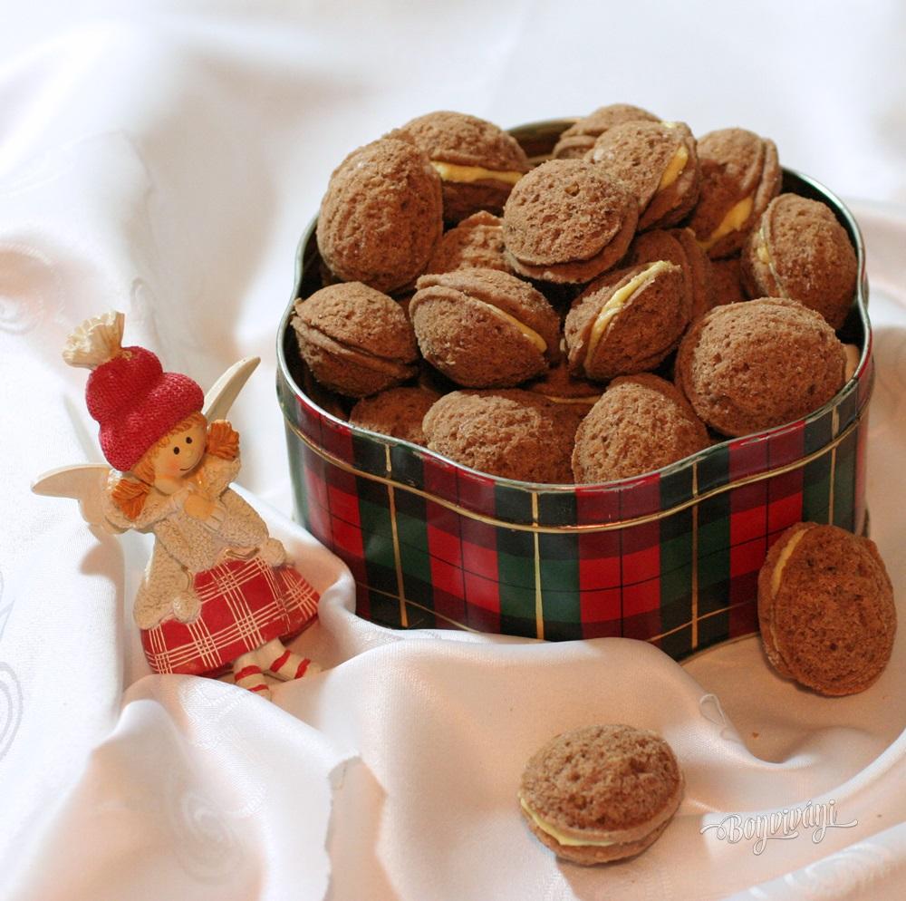 Vianočný recept na plnené orechy. Sú to skvelé jednohubky. Orechy sú plnené pudingovo-maslovým krémom. Ale dobré je pridať do cesta aj orechy (100g mletých orechov, 50g múky a 50g masla). Naplniť ich môžeme krémom ako v princezkách.