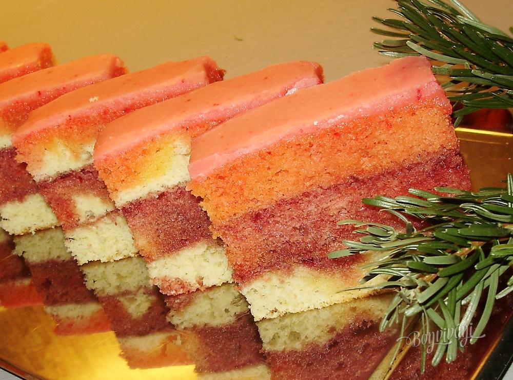 Druhý deň punčový rez polejeme citrónovou polevou: 300g cukor mletý, šťava z dvoch citrónov a trošku potravinárskeho farbiva sa poriadne vymieša. Ak je poleva hustá, pridá sa po lyžiciach horúca voda.