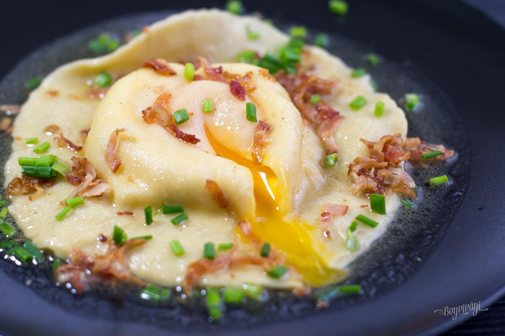 Je to vlastne jedna veľká raviola naplnená ricottou, ktorá chráni vaječné žĺtko. To sa pri prvom nakrojení krásne roztečie. Všetko je spolu spojené v jemnej maslovej omáčke s chrumkavou slaninkou. Úprimne, dá sa pri tejto predstave neslintať? :)