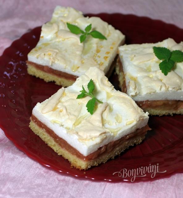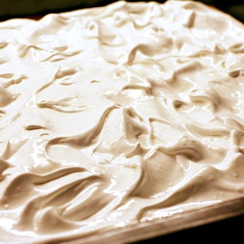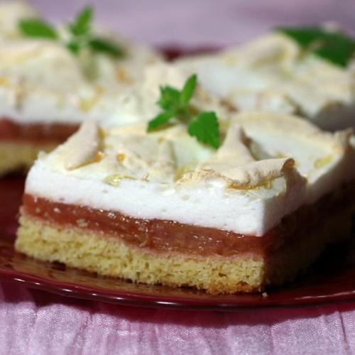 Po dvadsiatich minútach pečenia vyšľaháme z bielkov a cukru tuhý sneh. Potom vyberieme koláč a na horúci dáme sneh. Ak chcete, môžete ho uhladiť stierkou, ale stačí ho ledabolo roztiahnuť a stierkou po povrchu poťapkať. Vyzerá to zaujímavo. Plech vložíme nazad do rúry ešte asi na 15 minút dopiecť, kým sneh zhora trochu nestmavne.