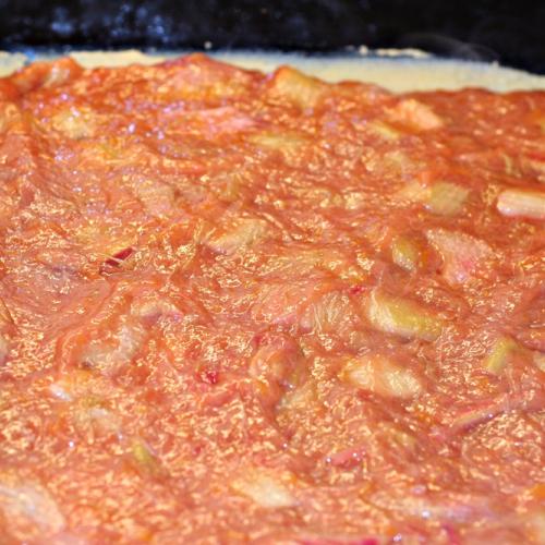 Pripravíme cesto. Môžeme ručne v miske vymiešať mäkké maslo s cukrom, pridať žĺtky a nakoniec vmiešať múku s kypriacim práškom. Ale jednoduchšie je všetko naraz hodiť do mixéru s nožíkmi a stroj nechať pracovať za nás. Cesto sa spojí do minúty. Potom ho preložíme na pomastený plech a rukami roztlačíme aj kúsok na boky plechu. Na cesto nalejeme ešte teplú rebarboru, povrch uhladíme a dáme do teplej rúry piecť asi 25 minút.