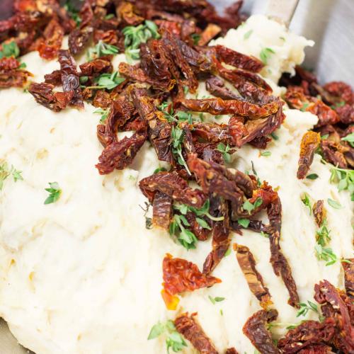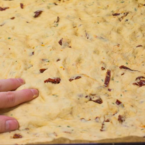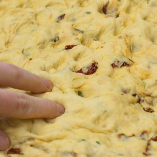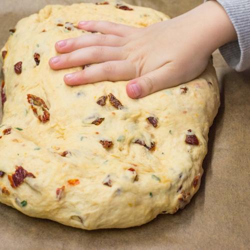 S cestom sa dobre pracuje, nemusia sa báť ani začiatočníci. Ja som v tomto recepte zvolila ako príchuť sušené rajčiny a tymián. Ale môžete pridať čokoľvek iné podľa nálady a vlastných zasob. Múku je možné použiť len hladkú. Ja mám radšej ju namixovať so špaldovou, kvôli zdravíčku. Ak nemáte po ruke kocku čerstvého droždia, nahraďte ho 2 polievkovými lyžicami sušeného.
