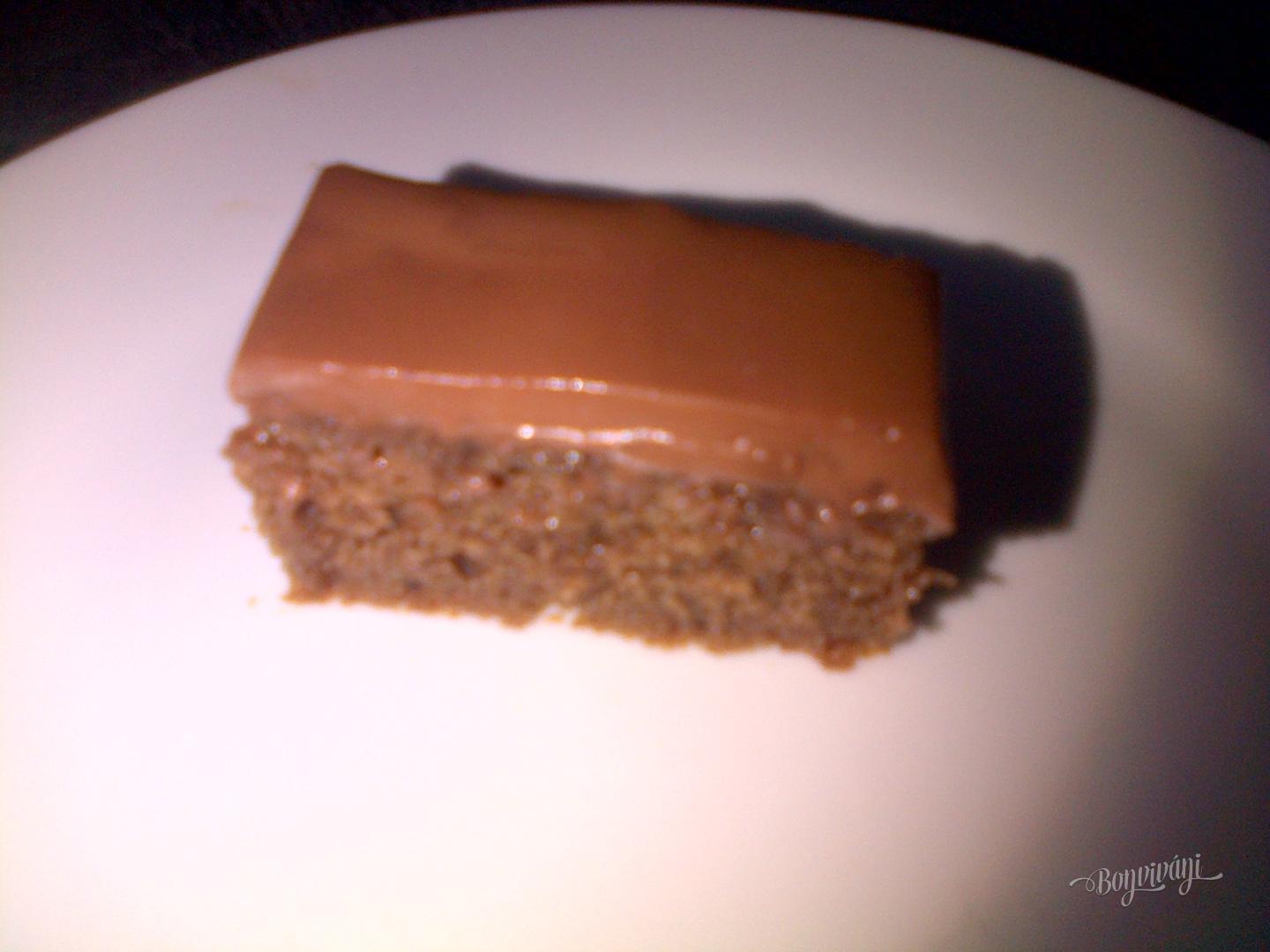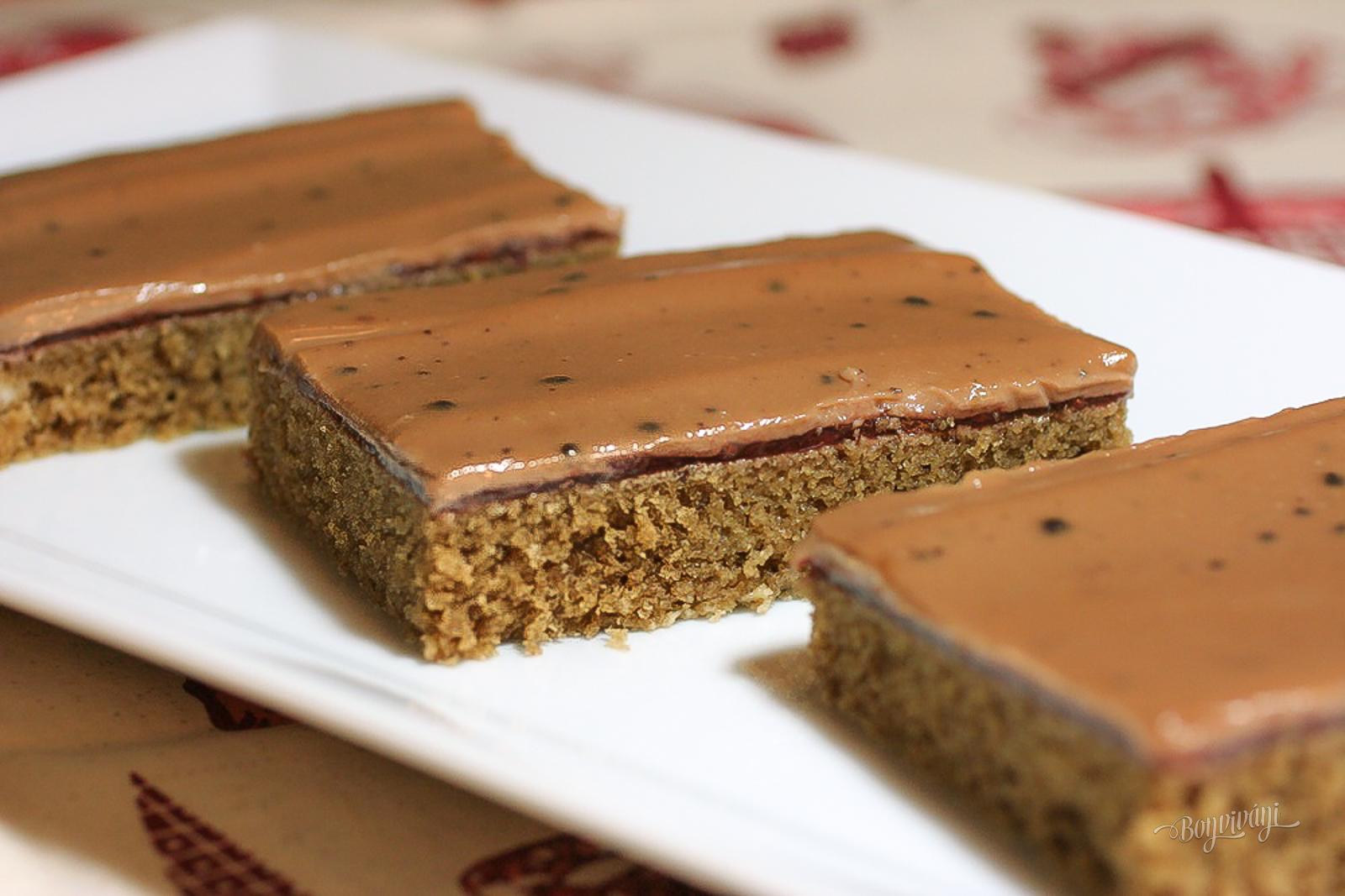 Upečený koláč vyberieme z rúry, ešte horúci potrieme tenkou vrstvou obľúbeného džemu a ihneď prelejeme polevou. Necháme vychladnúť a už aj degustujeme :)