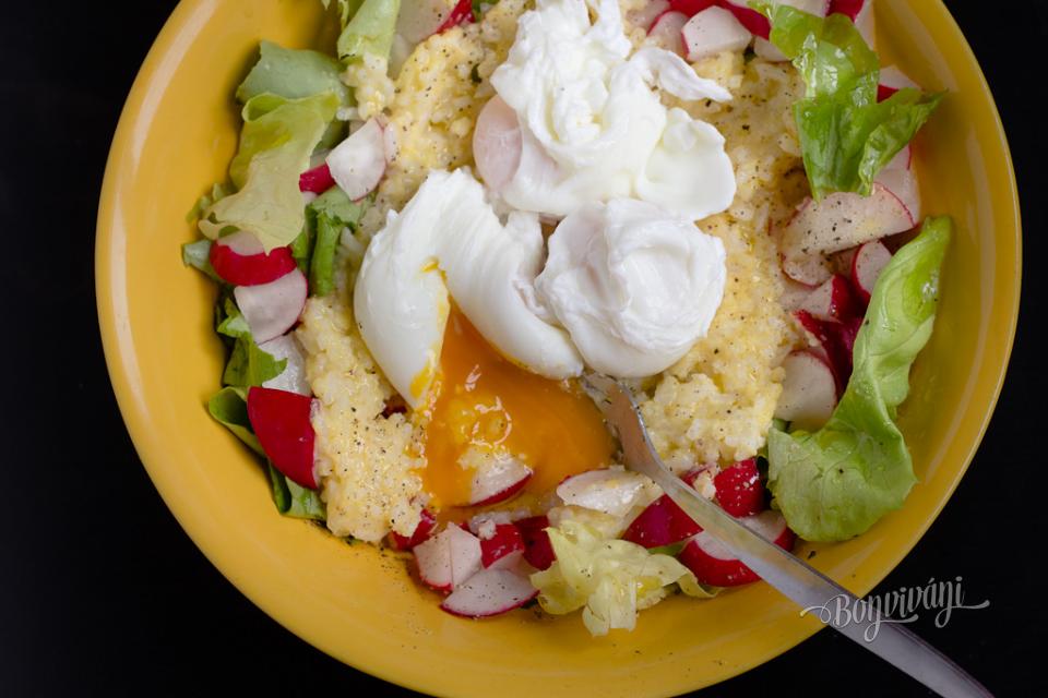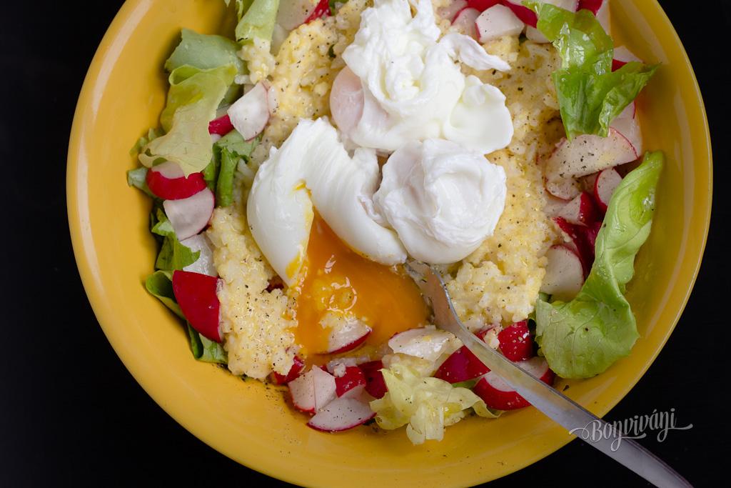 Vriacu vodu v hrnci stíšime na minimum a pridávame postupne jedno až tri vajcia, podľa toho na koľko máme chuť. Kým sa vajcia varia, čo je asi 3 minútky, navrstvíme si ryžovo-polentovú zmes na zeleninu na tanieri. Na to prídu ešte hotové vajíčka. A už len osoliť, okoreniť, pokvapkať olivovým olejom a hotovo!
