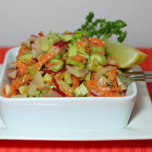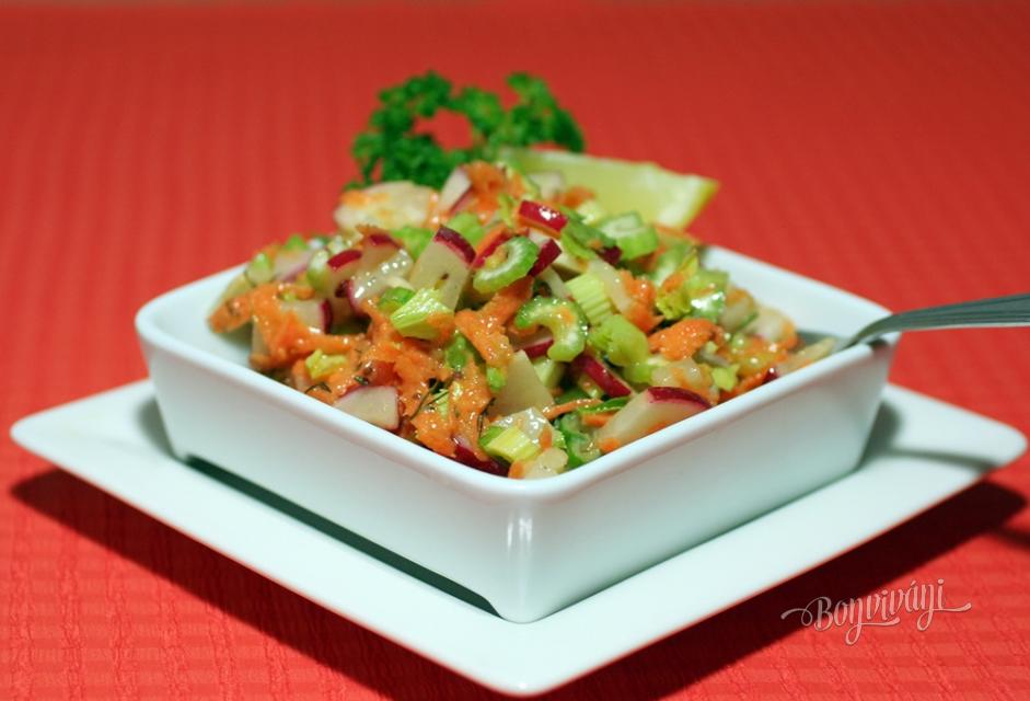 Očistenú zeleninu pokrájame na malé kúsky. Na tento šalát volíme tvrdšiu zeleninu. Kombinácia stonkového zeleru s jablkom, mrkvou a reďkovkou je výborná na chuť a tiež farebne lahodí oku.