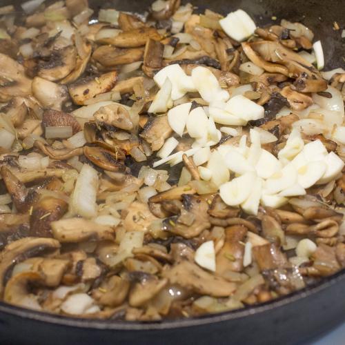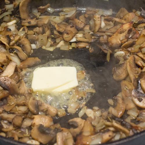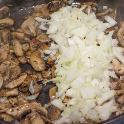 Šampiňóny očistíme, nakrájame na tenké plátky a orestujeme na lyžici oleja a lyžici masla spolu s rozmarínom.