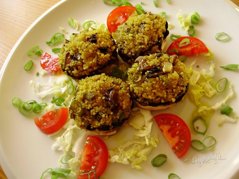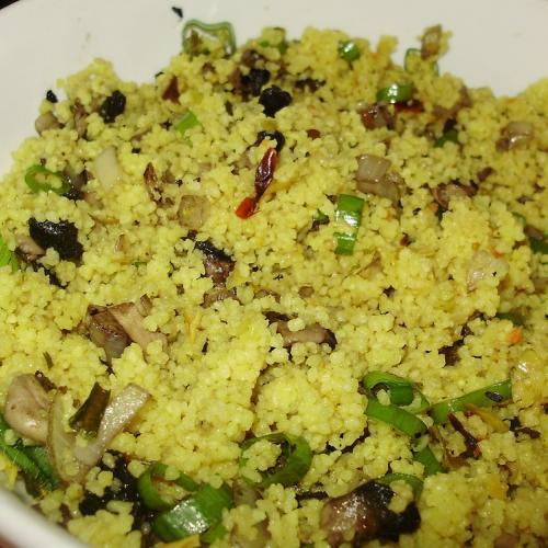 Krátko orestujeme, osolíme a vmiešame do kuskusu. Pridáme nasekanú jarnú cibuľku a premiešame.