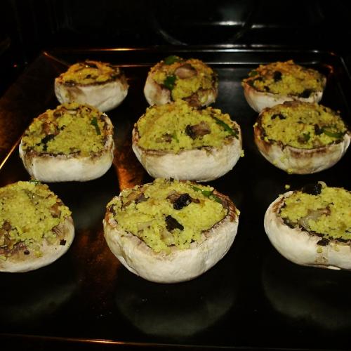 Príprava je celkom jednoduchá. Šampiňóny ošúpeme, vyberieme z nich nožičku, pokvapkáme ich olivovým olejom a dáme na plech.