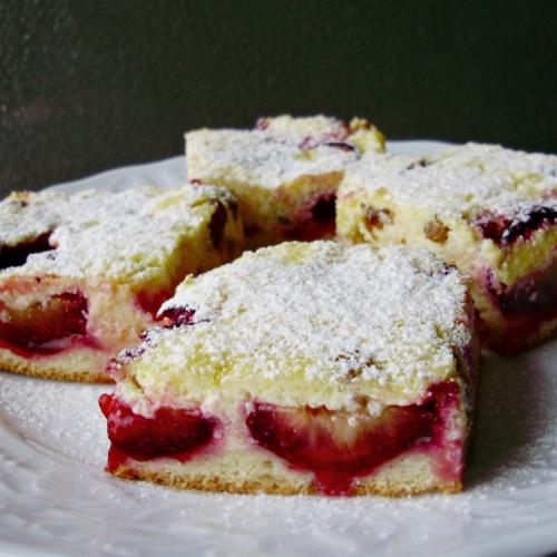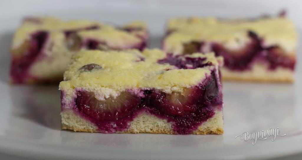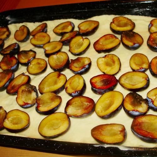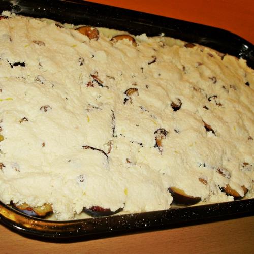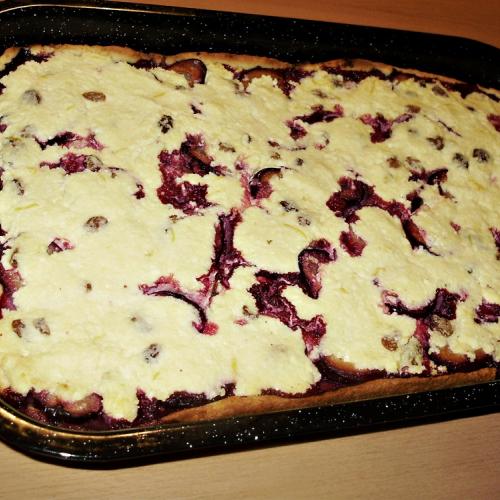 Tento koláč je z obyčajného bezvaječného kysnutého cesta, na vrchu slivky pokryté tvarohovou plnkou. Koláč je šťavnatý a veľmi chutný. Tvaroh som použila namiesto klasickej posýpky, aby sme mali zmenu.