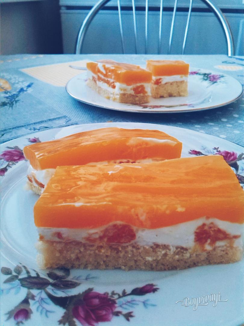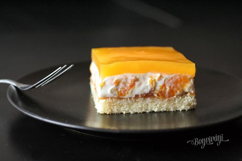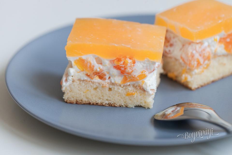 Osladenú smotanu zmiešame so scedenými mandarínkami a preložíme na korpus potretý džemom. Dáme do chladničky. Šťavu z kompótov dolejeme vodou, najlepšie v odmerke do objemu 700 ml. Potom prilejeme ešte 200 ml sirupu. Dáme do hrnčeka, vmiešame pudingové prášky a za stáleho miešanie privedieme k varu a po zovretí vypneme. Za stáleho miešania pudingové želé schladzujeme. Vlažné nalejeme na koláč najprv po okrajoch a zbytok do stredu.