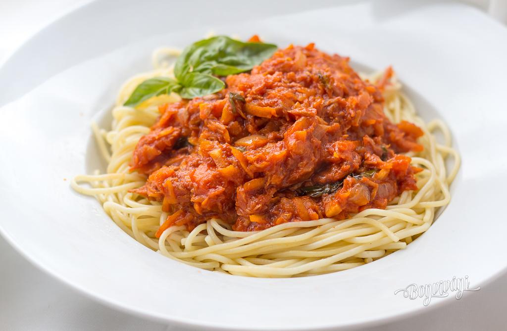 Pri podávaní môžeme posypať syrom. Ja mám aj rada pridať orestované žapmiňóny navrch. Omáčka vydrži bezpečne tri dni v chladničke. Ak vás špagety omrzia, môžete ju využiť na prípravu slaného koláča z lístkového cesta, ako náplň do raňajkových toastov namiesto kečupu a podobne..