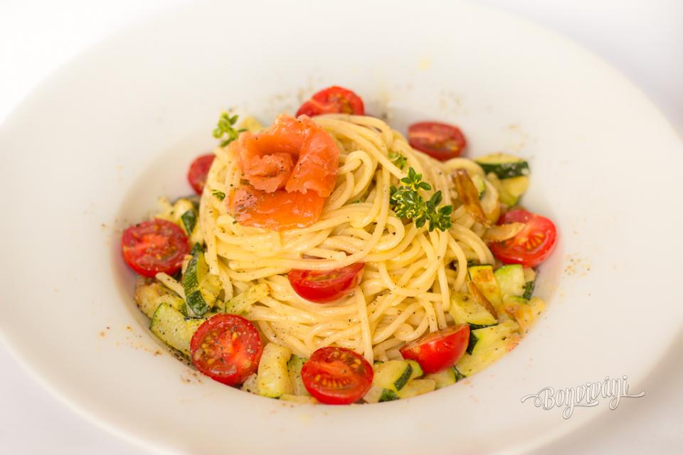Veľmi rýchle špagety, ideálne na letné dni. Stačí mať kvalitnú zeleninku a olivový olej. Losos dodá bielkoviny a citrónový tymián jedlo krásne prevoní.