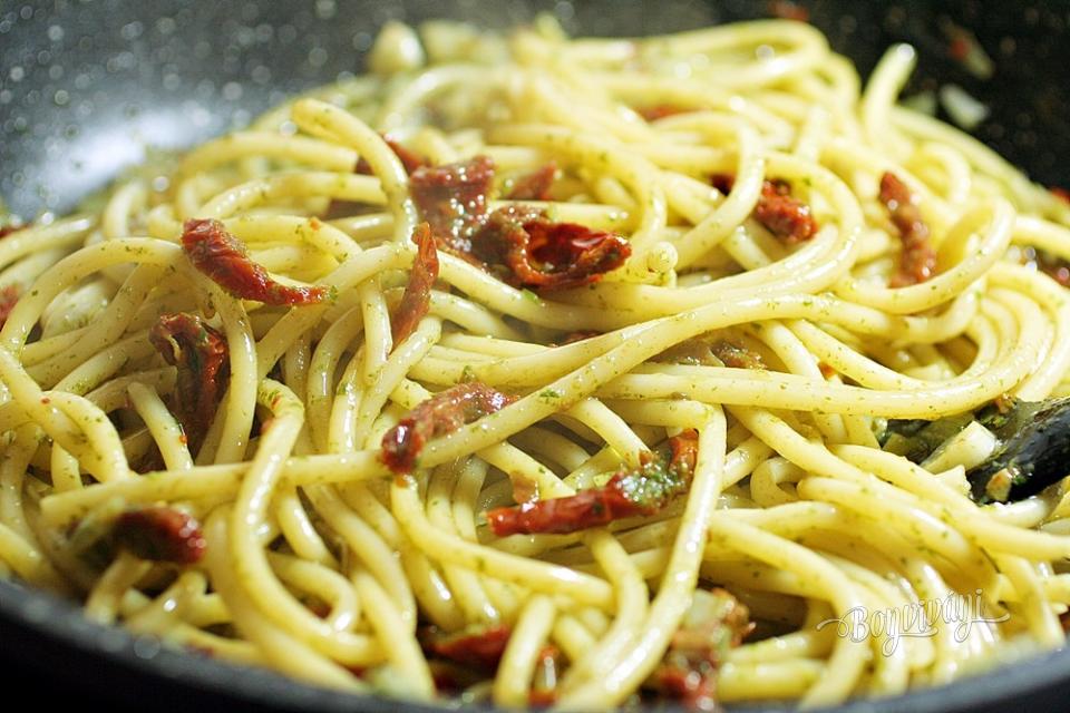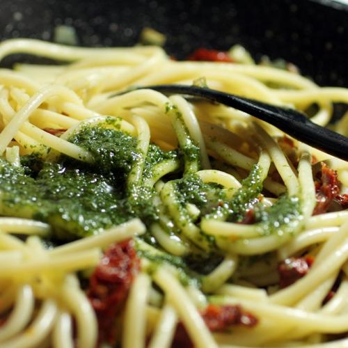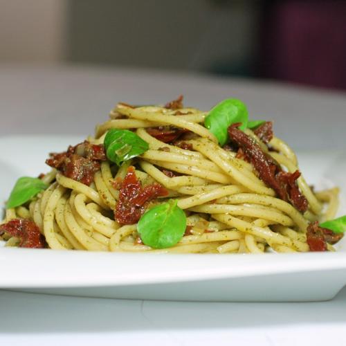 Na chuť sušeným paradajkám som prišla len pred pár rokmi. Občas som ich kupovala, no už si ich suším a nakladám sama. Bazalkové aj iné bylinkové pesto si tiež pripravujem sama, ale dá sa celkom bežne kúpiť v každej lepšej predajni potravín.